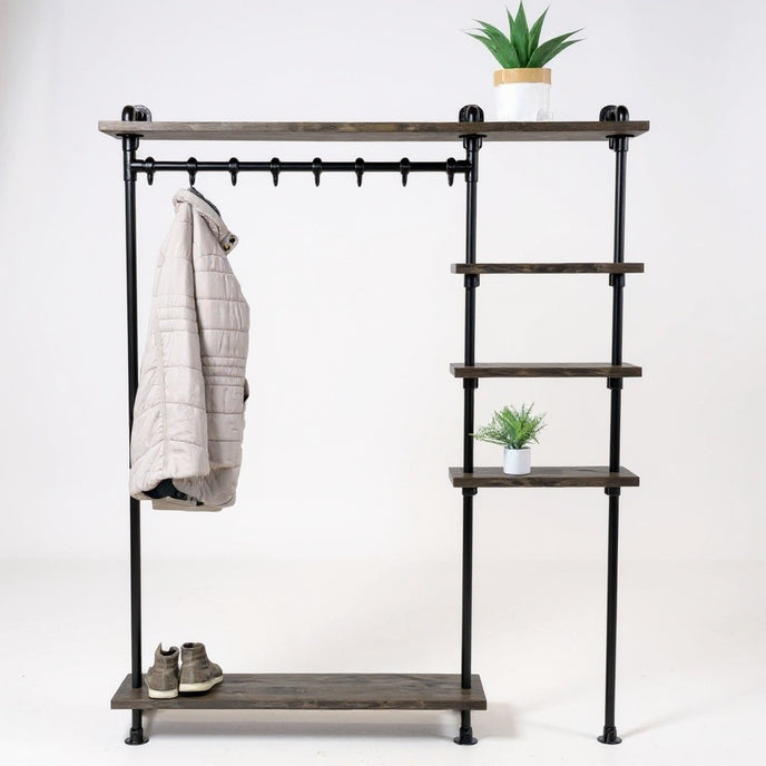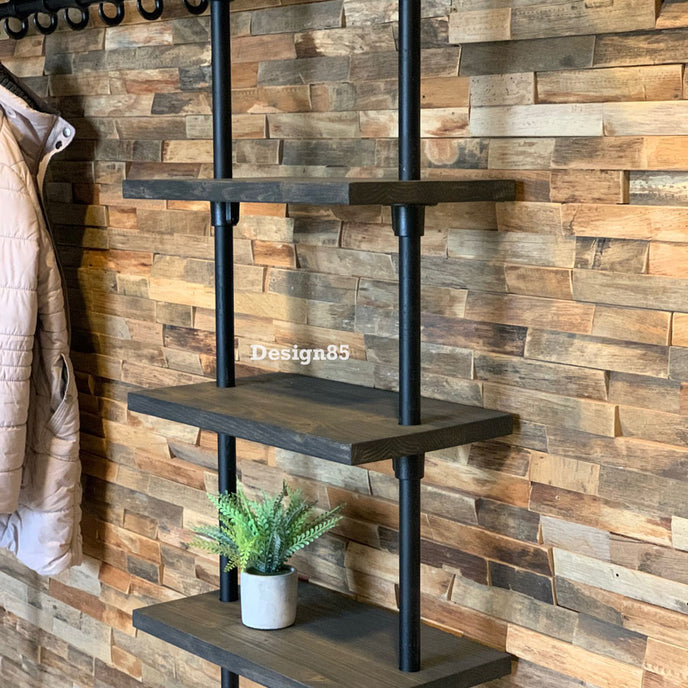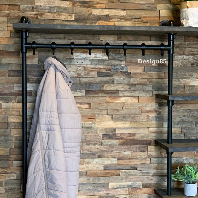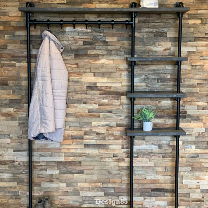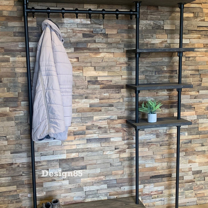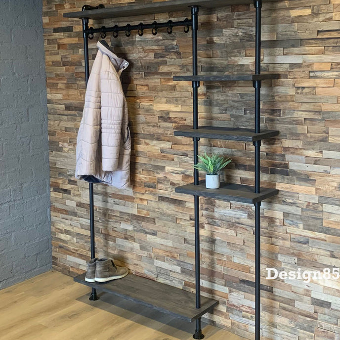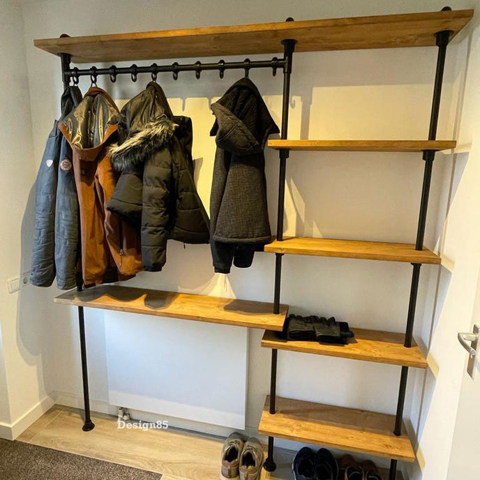 De industriële kapstok Glinstering mag gezien worden bij de entree van je woning. De kapstok bestaat uit legplanken die leverbaar zijn in diverse afmetingen en kleuren. De buizen van de kapstok zijn zwart en de totale hoogte bedraagt 205cm. De kapstok kan op maat worden gemaakt, vraag vandaag je maatwerk kapstok nog aan!