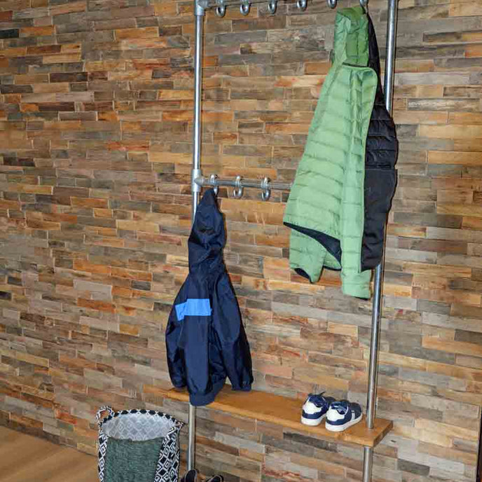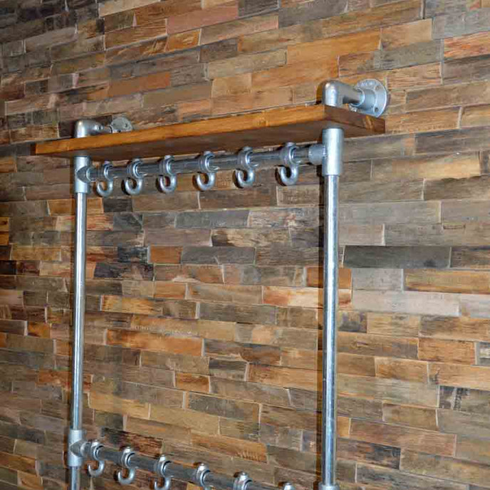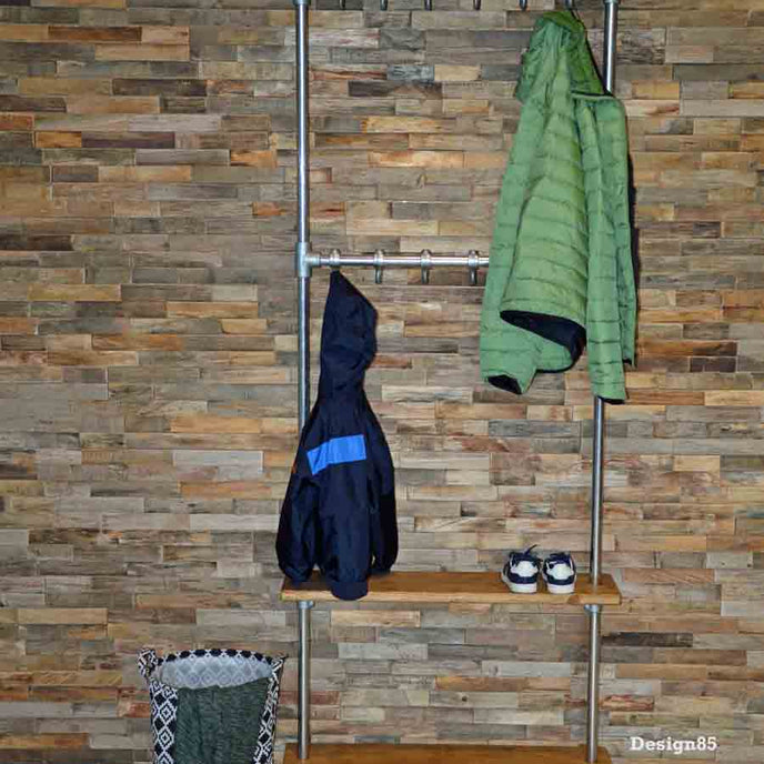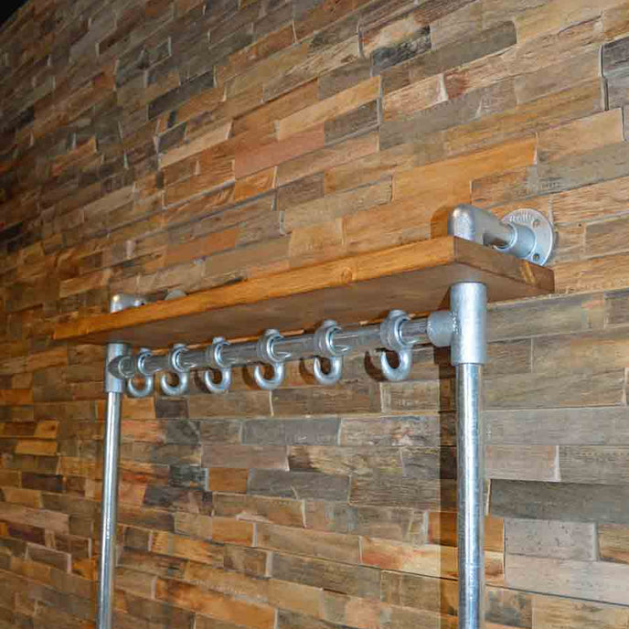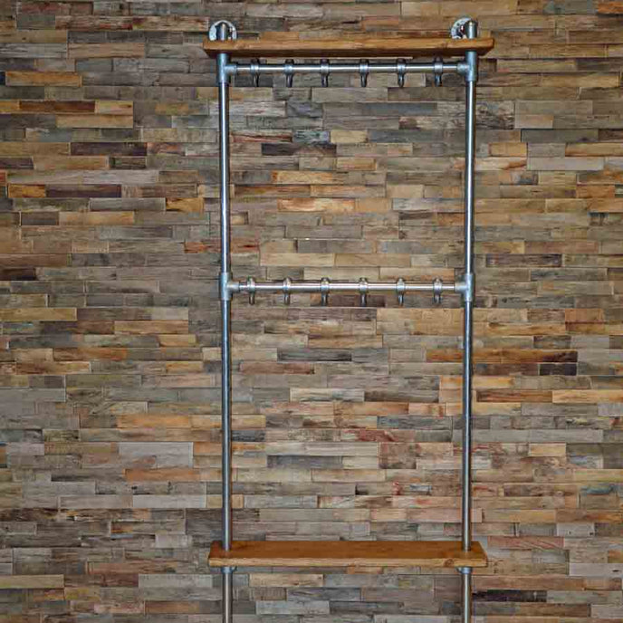 De steigerbuis kapstok Kordaat geeft je entree een stoere en industriële look. De kapstok Kordaat bestaat steigerhouten legplanken en verzinkte steigerbuizen. De kapstok is in diverse afmetingen te bestellen en de totale hoogte bedraagt 205 cm. De kapstok kan op maat worden gemaakt, vraag vandaag je maatwerk kapstok nog aan!
