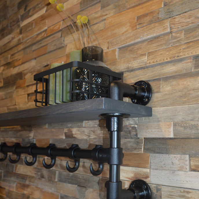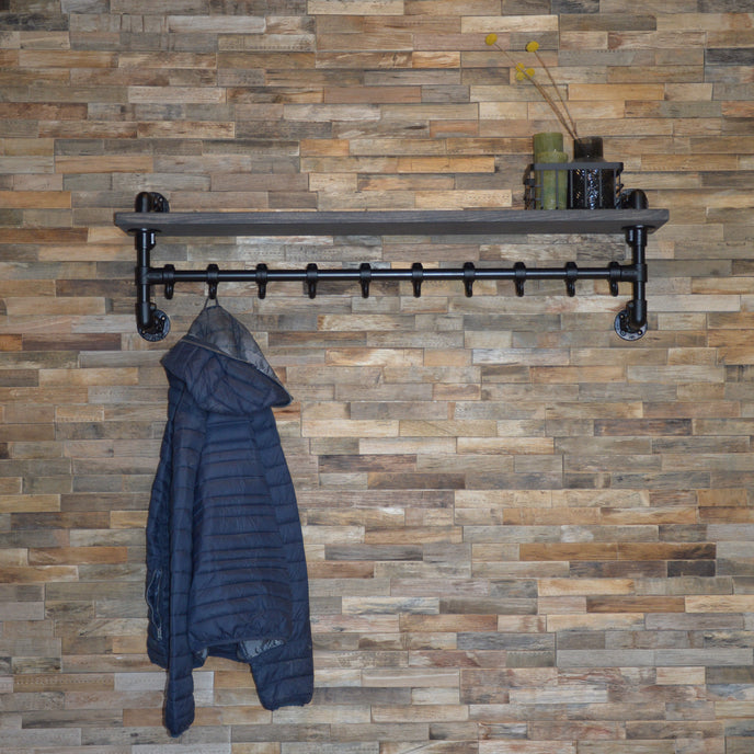Aan de steigerbuis kapstok, type Wand kunnen diverse haken worden geplaatst om jassen, sjaals, mutsen en andere accessoires aan op te hangen. Standaard worden er zes stuks haken meegeleverd. Geschikt voor elke hal, kleedkamer, slaapkamer of welke andere ruimte in je woning. Op de legplank kun je accessoires op de kapstok plaatsen, bijvoorbeeld sjaals en mutsen. Om de kapstok een industriële look te geven, is het mogelijk om de legplank te voorzien in een wax.